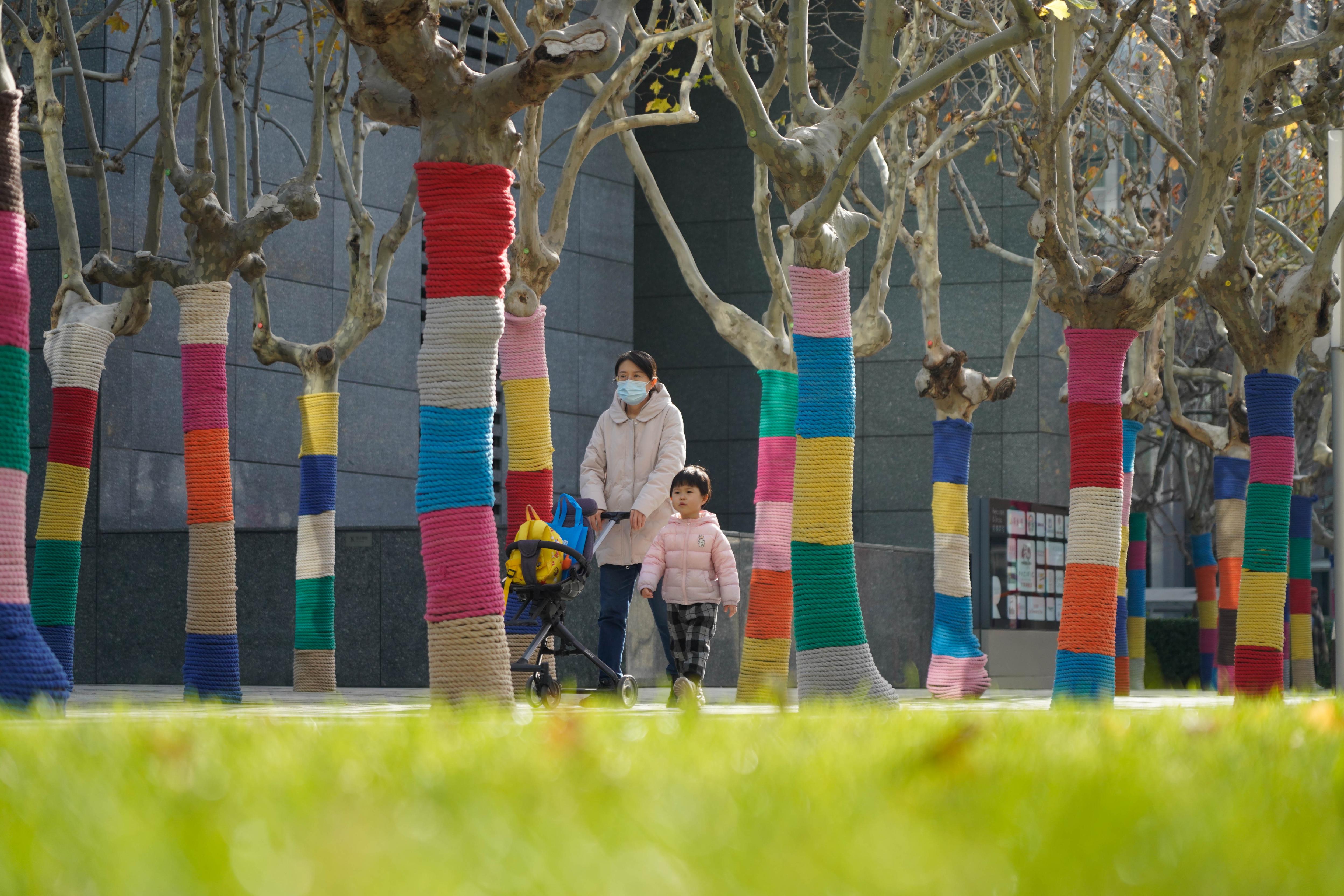 11月29日,北京市民在“披”上彩色针织 “外套”的行说念树间行走。新华社记者 谢晗 摄
