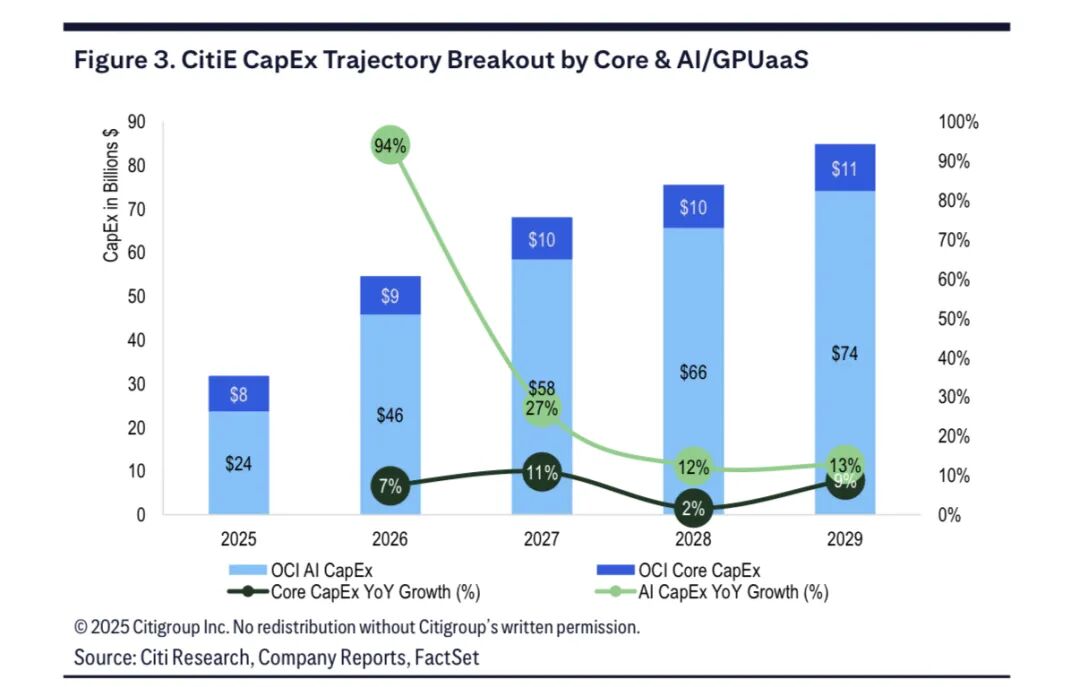 Citi将FY26 CapEx预期上调至$40B+(共鸣仅$35B),并展望AI OCI本钱开销将来数年将攀升至$60B-$70B年均水平——这是押注Oracle能在这场AI基建武备竞赛中抓续吃到红利。